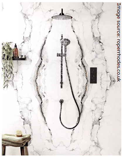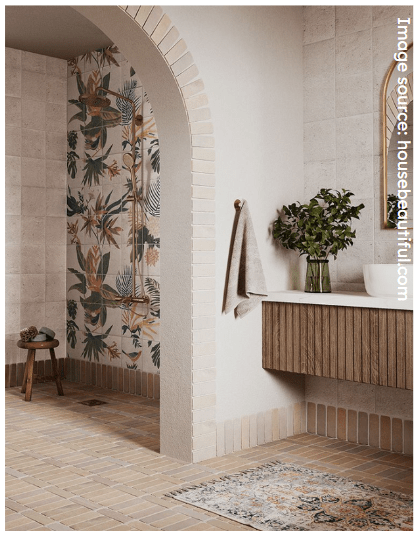 Walk in shower with rainfall shower head, often including a bench seat to encourage relaxation. Combined with soft inviting colours & open shelving.