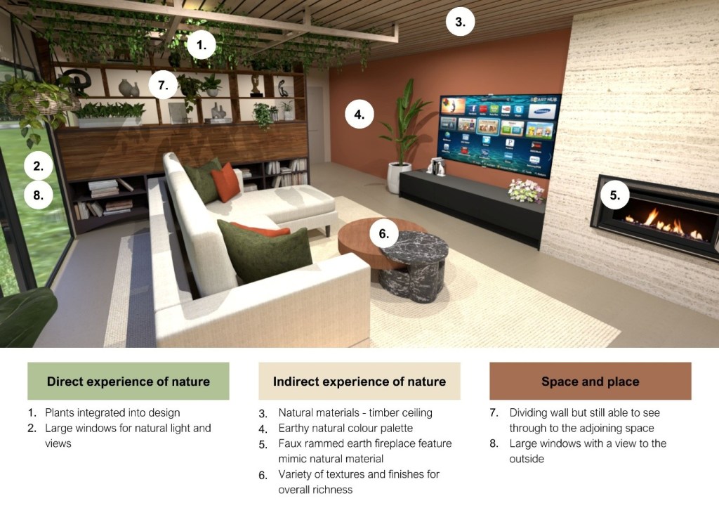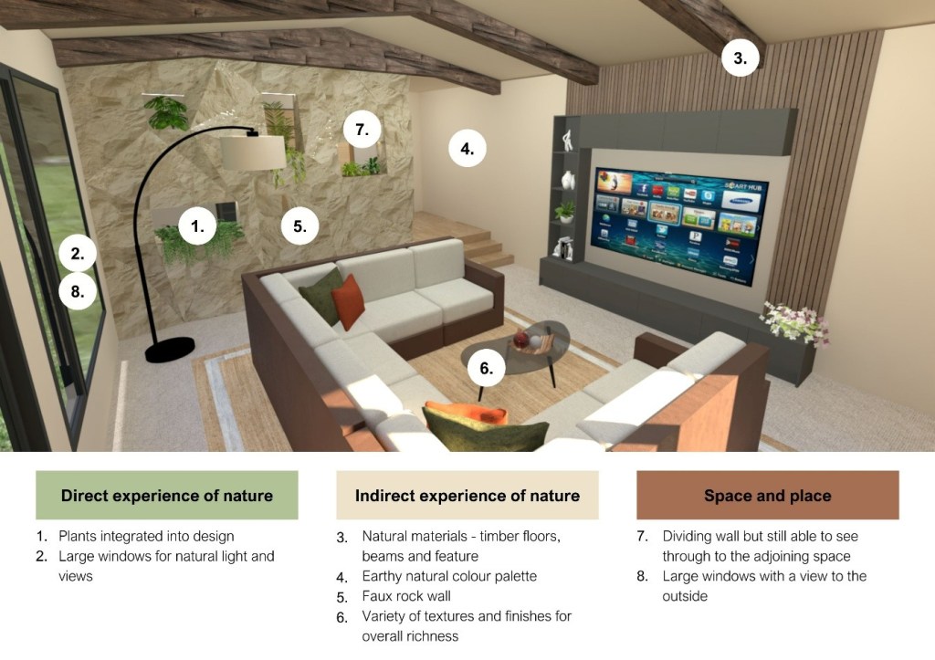 Nurtured by nature! Biophilic design is an ancient design practice with a foundational philosophy, of living spaces that foster a connection to nature give positive benefits to the people that inhabit them. More than just a passing trend, this design style is growing in popularity as research outlines the positive benefits. But how can you apply this design philosophy into your own home? Here we outline what the three main design strategies are that can be applied to any design project. Then we show how we have adapted these to two direct concept designs for a living room space.