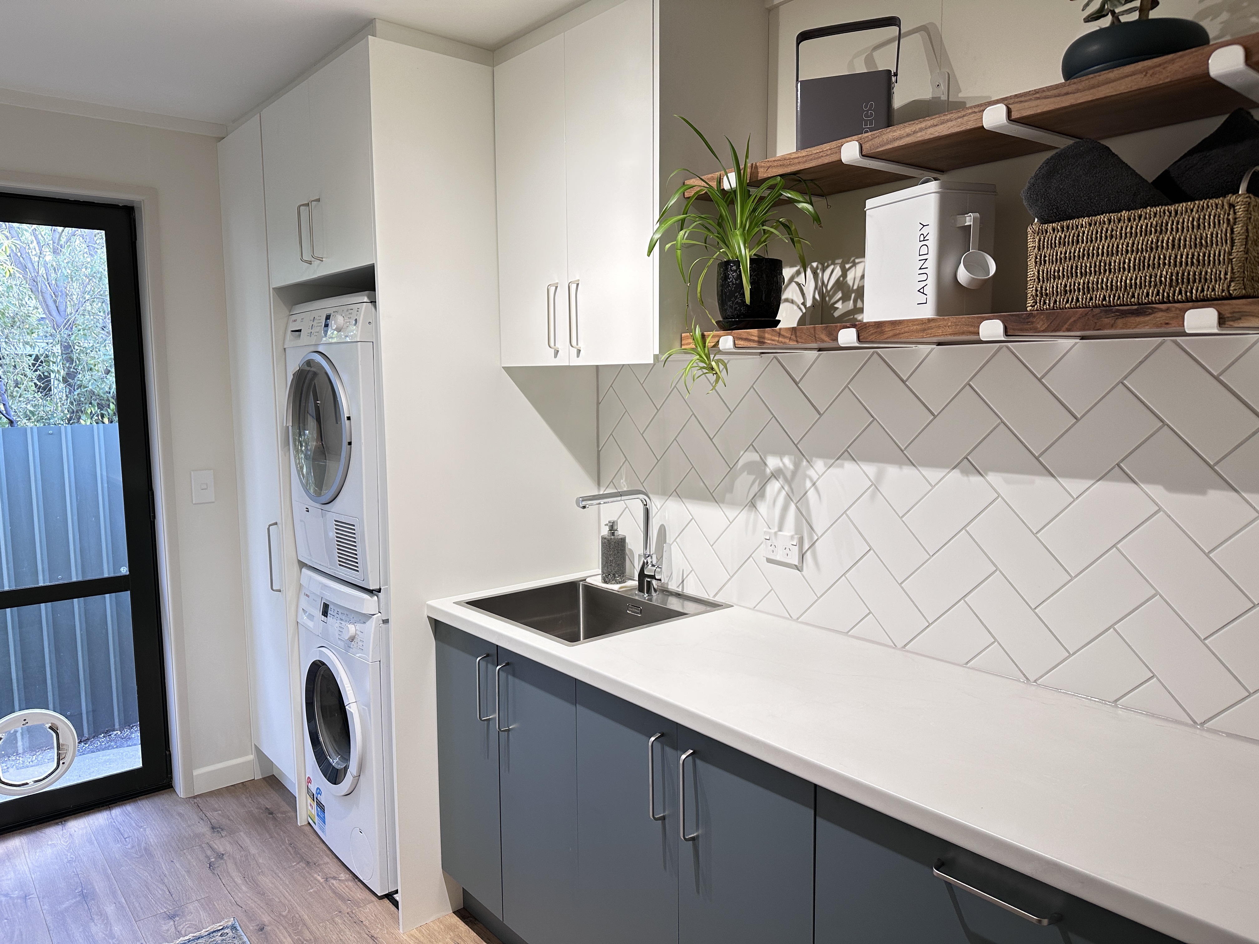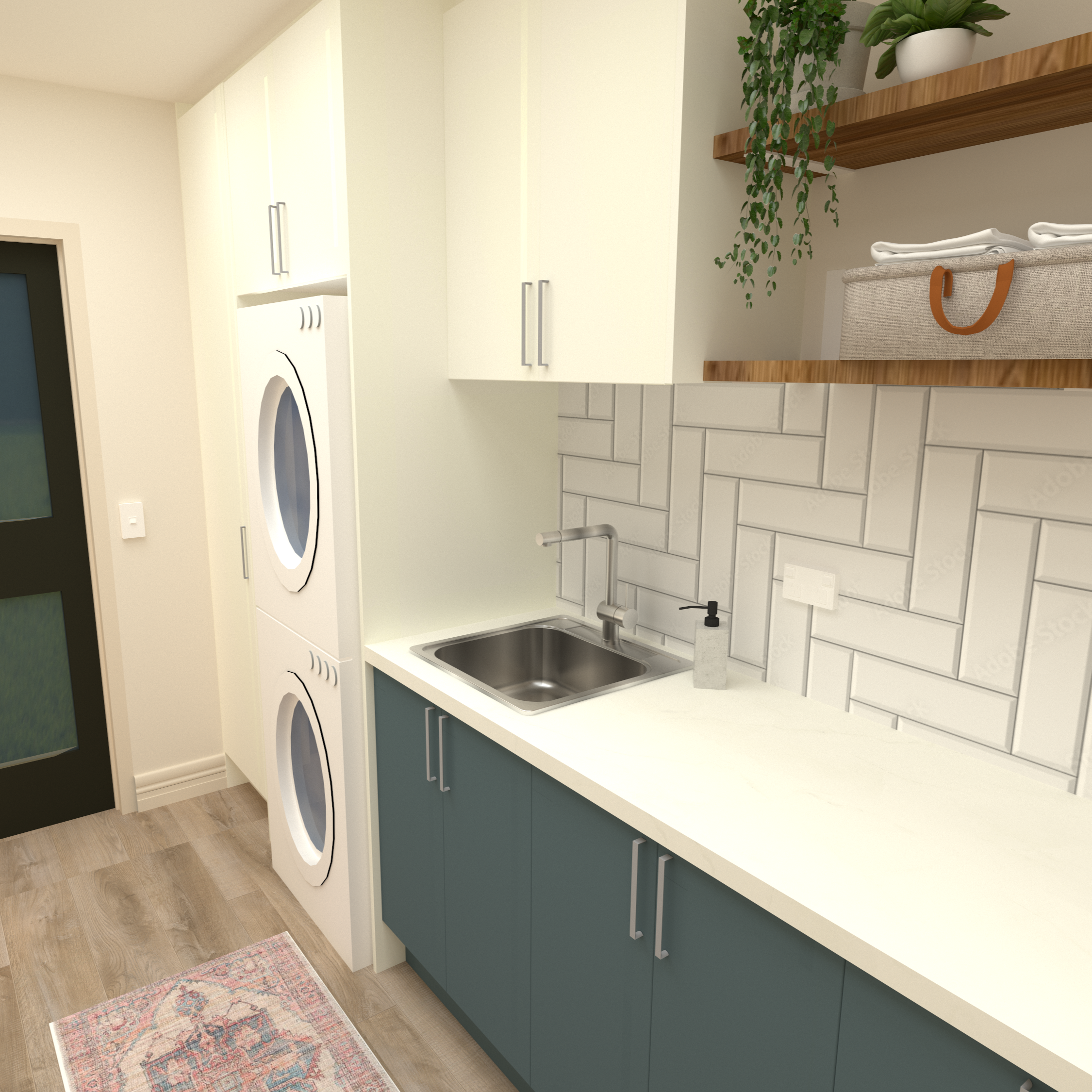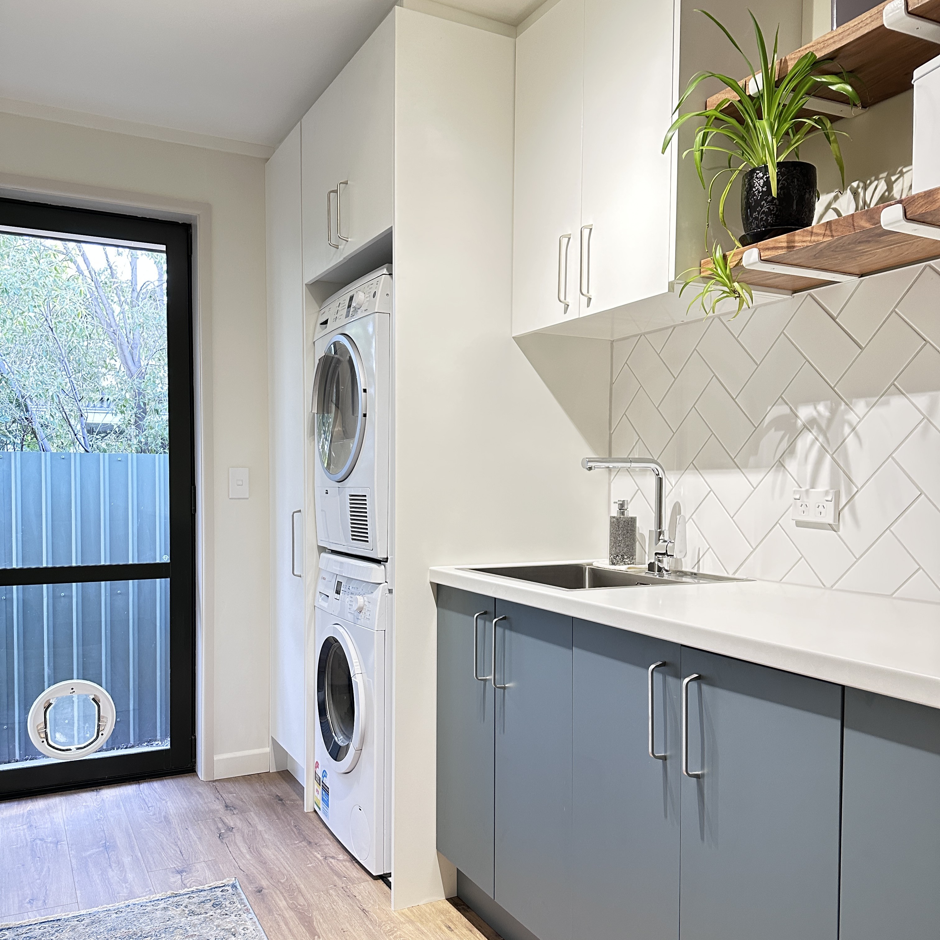A soft heritage influence is achieved through a curated selection of materials. Villa white walls pair with organic grain timber laminate. Muted heritage blue base cabinets ground the laundry space. Whereas, as the warm white tall and upper cabinets keep the space light and bright. The benchtop with its subtle grey marble veining matches the dove grey grout in the herringbone tile splashback. V-groove panelling lines the opposing wall to add textural depth. Lastly a delicate brushed nickel handle with rounded corners adds softness and completes the look. For cohesion with the rest of the home the hallway floor was also replaced to match the laundry for a seamless transition between the spaces.