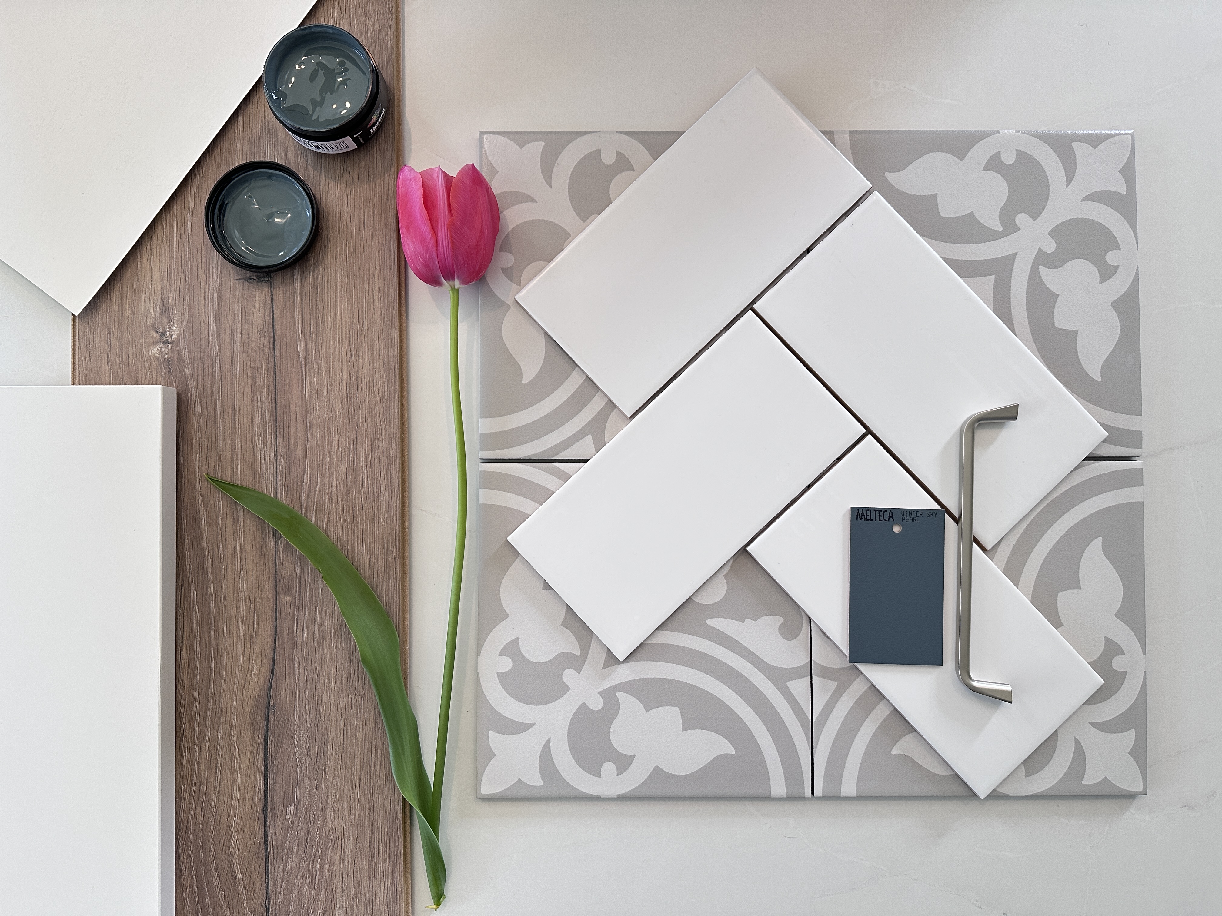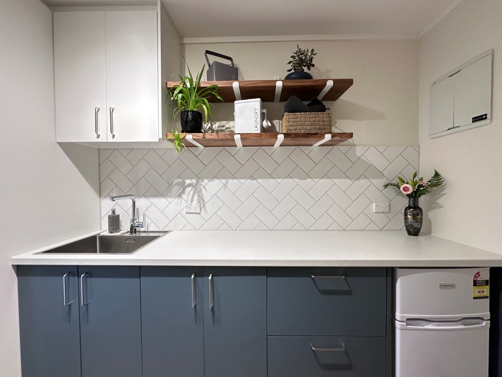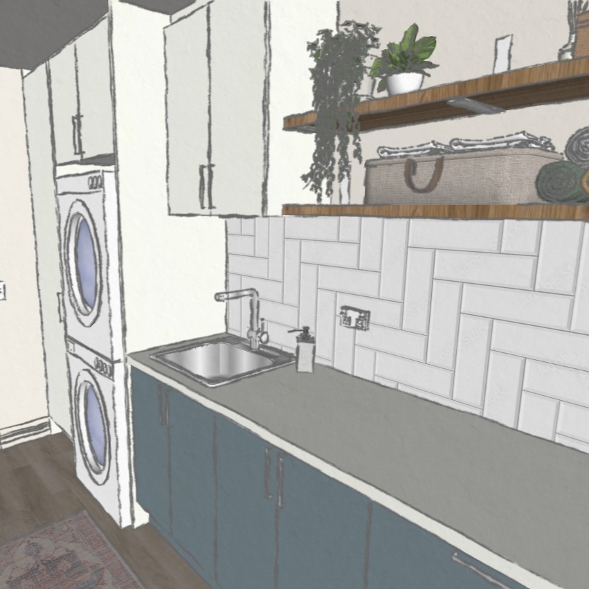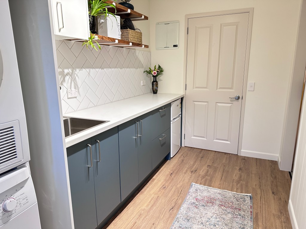 A soft heritage influence is achieved through a curated selection of materials. Villa white walls pair with organic grain timber laminate. Muted heritage blue base cabinets ground the laundry space. Whereas, as the warm white tall and upper cabinets keep the space light and bright. The benchtop with its subtle grey marble veining matches the dove grey grout in the herringbone tile splashback. V-groove panelling lines the opposing wall to add textural depth. Lastly a delicate brushed nickel handle with rounded corners adds softness and completes the look. For cohesion with the rest of the home the hallway floor was also replaced to match the laundry for a seamless transition between the spaces.